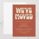 Celebrate your new home with this vintage-inspired housewarming party invitation featuring warm rust tones and groovy retro lettering. The 70s-style typography and minimalist design create a fun, welcoming vibe for your celebration. Fully customizable with your party details, address, and RSVP information. Perfect for inviting friends and family to tour your new place.
