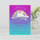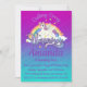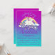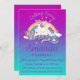 Este convite de aniversário, que é extremamente personalizável, apresenta uma magnífica caricatura unicórnio e um belo fundo gradiente de teal e roxo.