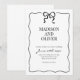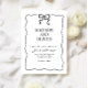Design feature a simple black and white design with a cute hand drawn wavy border and a small black bow at the top. Using a clean classic font and handwritten calligraphy script. It looks elegant but also a little playful.