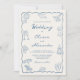 This whimsical coastal dusty blue and ivory wedding invitation is elegant with a relaxed seaside aesthetic, featuring a wavy scallop frame, hand drawn beach doodles, and casual handwriting script.