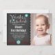 Um convite de festas de primeiro aniversario para uma garotinha. Apresentando flocos de neve azuis e vermelhos em um fundo chalkboard. Personalize facilmente com a foto do seu filho e as informações da festa.