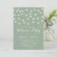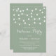Convite de festas elegante e caprichoso com luzes de fada brancas suspensas sobre um fundo verde sábio. Este convite é perfeito para eventos ao ar livre.