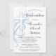 Um bonito convite de confirmação branco e azul com uma cruz branca com espirais azuis ao seu redor.
