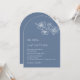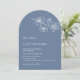 This elegant contemporary arched wedding invitation features white line art flowers and white script on a dusty blue background.