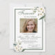 Este convite apresenta um elegante verde de flores brancas e uma armação com a foto do ente querido que partiu no centro. Apenas personalize o convite e substitua a foto do seu ente querido e informações sobre o funeral/serviço de memórias. Você pode personalizar o convite para qualquer maneira que você gostaria de lembrar e honrar a memória de seu ente querido. Por favor, note: "Para sempre em nossos corações", as flores brancas de aquarela verde com quadro e outros elementos gráficos e trabalho de arte não podem ser editadas, alteradas, excluídas ou movidas. Eles estão consertados.