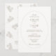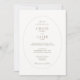 Elegant and chic. This modern lux wedding invitation card features a contemporary set of taupe fonts and calligraphy accents alongside a oval framed border frame. The back includes a subtle botanical pattern overlay, couple names and wedding website address against a ivory white background.
