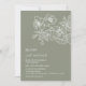 This elegant contemporary wedding invitation features white line art flowers and white script on a sage green background.