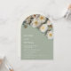 This elegant wedding invitation features textured white yellow roses on a sage green background with first names only.