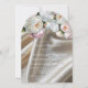 A high-resolution botanical illustration of a luxurious bouquet of white roses and white peonies against a white satin texture pattern with white snowy glitter. The arrangement features six fully bloomed peonies and three unopened buds. The largest peony in the center is pure white with delicate layered petals. To its right is a pink-peach colored peony with subtle red veining throughout. The flowers are accompanied by rich green leaves and stems. The leaves are large, glossy, and have prominent veining. The buds are a mix of light pink and cream colors, with one bud showing a deeper pink coloring at its base. The composition is symmetrical, with flowers positioned at different heights to create depth. The petals have a soft, velvety texture with subtle shadows that enhance their dimensional quality. The illustration has a painterly quality with careful attention to the natural variations in the flower petals and leaves.