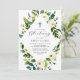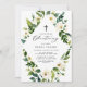 Convite de batização do tema floral branco. Apresenta uma estrutura floral de diamante de aquarela de flores brancas, folhagem verde e cruz. Este convite de quadro floral é perfeito para os batizados de inverno e primavera. Personalize adicionando seus próprios detalhes.