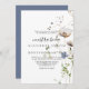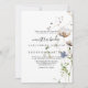 Este convite de casamento da nuestra floral da floresta selvagem é perfeito para um casamento tropical. Este design apresenta flores da floresta selvagem, brancas e azuis, pintadas manualmente, com folhagem verde.