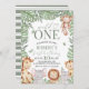 Celebrate your little one’s first birthday with this adorable Wild One jungle-themed invitation. Featuring watercolor safari animals — lion, giraffe, elephant, monkey, and tiger — surrounded by lush green tropical leaves. Perfect for a jungle, safari, or wild one themed first birthday party. Personalize easily with your child’s name, date, and details for a memorable celebration.
