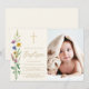 This floral Baptism photo invitation features wildflowers and a cross with stylish gold script typography on a soft cream background.