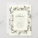 Este floral de inverno no convite de festas de celebração de vamos de marfim é perfeito para um noivado elegante, solteira, aposentadoria ou qualquer evento ou festa. A simples design rústica apresenta flores brancas com folhas de eucalipto e verde de inverno, com uma sensação moderna de país.