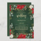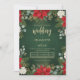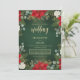 This elegant Christmas wedding invitation showcases a rich deep green velvet background, adding warmth and sophistication to your celebration. The top and bottom edges feature lush festive florals, red poinsettias, creamy white roses, pine, eucalyptus, and mistletoe, all softly blended in a painterly, luxurious style. Fine gold sparkle accents bring a subtle holiday glow without overpowering the design. The softly illuminated center includes editable text, allowing you to personalize your wedding details with ease. Perfect for couples seeking a timeless and romantic winter aesthetic.