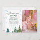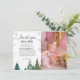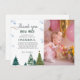 Elegante cartões de agradecimentos de comemoração de inverno com ilustração aquosa de pinheiros e flocos de neve. As palavras leram "obrigado você nevar muito pelo fazer do meu aniversário ONEMaravilhoso."