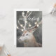 Uma cena serena de inverno na neve de inverno com luzes brilhantes de cordas em suas galhadas, e feliz Natal em uma letra de roteiro. Um cartão de saudação rústico na moda para os feriados.