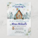 Celebrate the arrival of your sweet little one with this charming Winter themed Baby Shower invitation. The design features a cozy watercolor gingerbread house topped with snowy icing, surrounded by a winter forest of pine trees and icy blue floral accents.