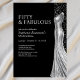 Celebrate a milestone in style with this luxurious 50th birthday invitation featuring a stunning silver evening gown on a black background, paired with the bold statement “Fifty & Fabulous.” The back design completes the look with silver high heels and the playful phrase “Let’s Party,” making this invitation perfect for a chic, glamorous celebration.