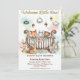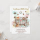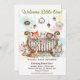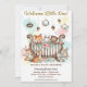 • A beautiful watercolor design featuring baby forest animals—a fox, rabbit, bear, deer, and owl—peeking over a rustic wooden crib decorated with soft roses and greenery. This sweet set is perfect for a bohemian or woodland-themed baby shower.