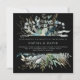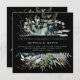 Esses convites de casamento botânicos de tendências apresentam folhas verdes, azuis e aquáticas de cor de cinza e folhas de eucalipto com sotaques de ouro falsos sobre fundo preto. Suas iniciais vão para trás.
