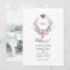 Convite de casamento em aquarela, com uma crista temática sobre floresta branca, personalizável com as iniciais do casal. O código QR no verso direciona para o seu local de casamento onde o pessoas pode aprender mais e rsvp.