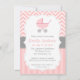 Convite de chá de bebê feminino elegante e sofisticado. Apresenta uma cadeira de bebê cor-de-rosa com padrão de bolinhas, um fundo composto por dois padrões, um zigue-zague rosa e branco e listras cor-de-rosa. Também inclui um centro branco com efeitos de costura para indicar os detalhes da festa. Este simples cartão de convite com sua paleta de rosa, branco e cinza é perfeito para qualquer pessoa que esteja planejando um chá de bebê ou precise de um anúncio para a chegada de uma menina recém-nascida. O cartão de convite pode ser facilmente personalizado com os detalhes da sua festa.