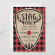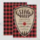 Reúna o grupo e celebre o noivo com este convite de festa de despedida de solteiro com tema de veado e xadrez de búfalo, rústico e bonito. Misturando perfeitamente uma estética clássica de "lenhador" com tipografia moderna, este design define o tom para uma noite de confraternização, cervejas e celebração. O design apresenta uma borda atemporal em xadrez vermelho e preto que grita "grande ao ar livre" e o texto central é abrigado em um brasão ousado em estilo de escudo, definido contra uma textura de papel kraft vintage. Os chifres de veado desenhados à mão enquadram o título "Festa de Despedida de Solteiro" para um toque masculino e rústico, e as silhuetas detalhadas de pinheiros fundamentam o design, tornando-o ideal para viagens de camping, fins de