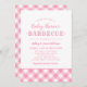 Convite moderno à chá de fraldas para um evento casual de CHURRASCO de quintal em bonito cores rosa e brancas com uma borda de xadrez de toalha de gingham. Perfeito para um casal esperando uma menina!