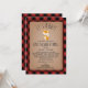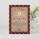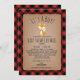 Um convite de chá de fraldas com uma ilustração de uma raposa bebê. Personalize o texto. O fundo é vermelho e a xadrez preta de lenhador inspira o padrão de xadrez de búfalo.