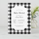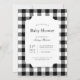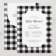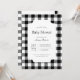 Convite de chá de bebê clássico e atemporal em xadrez preto e branco. Estilos de fonte e layout personalizáveis, apresentando um fundo simples com um padrão de xadrez geométrico limpo. Perfeito para convites de chá de bebê unissex, convites de chá de bebê masculino e convites de chá de bebê preppy.