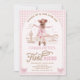Arcos rosa-xadrez Raparigas Primeiro primeiro aniversario Rodeio Convite Raparigas Rosa e Marrom fazem o primeiro convite de aniversário com uma paisagem desértica com cacto, arcos cor-de-rosa, cabeçalho de texto tipo corda e imagem de vaquinha. O primeiro convite de aniversário de rodeio desta rapariga é ideal para uma festa de aniversário selvagem do oeste.