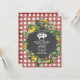 Um convite de chá de bebê com um design geométrico inspirado em quadro-negro, rodeado por flores silvestres de olho preto e folhagens sobre um fundo xadrez vermelho. Ilustração de porco no centro.