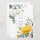 Invite your guests with the fresh, sophisticated charm of this elegant wedding invitation. The design features stunning, painterly watercolor bouquets gracefully arranged in opposite corners, set against a crisp white background. A beautiful golden-yellow chrysanthemum provides a vibrant focal point in the lower arrangement, perfectly complemented by lush, creamy white peonies or garden roses in the upper corner. This exquisite composition is artfully interwoven with delicate yellow filler flowers and buds, alongside abundant sprays of dusty sage and blue-green eucalyptus leaves, creating a fresh, natural, and contemporary feel. A minimalist, thin pale teal-green rectangular frame provides a perfect, modern space for your event details. Ideal for spring or summer weddings with a modern, elegant theme, this invitation design is also perfect for sophisticated bridal showers, garden parties, anniversary celebrations, or milestone birthday events. This versatile design can also be adapted for stylish corporate events, seasonal promotions, or elegant announcements requiring a touch of refined floral beauty.