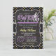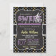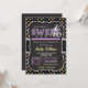Cute Sweet 16, 16, convite para estrelas amarelas, pretas e cinzas, padrão noturno estrelado com elementos de design ric roxo. 16, 16 festas de aniversário convidam para garotas. Vintage sente fontes de giz roxas e amarelas em fundo legal de quadro negro.