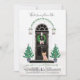 Apresentando um pequeno Yorkshire Terrier (Yorkie) vestindo um cachecol rosa! Uma varanda frontal clássica decorada para as férias, com árvores de Natal com estrelas flanqueando a elegante porta preta, uma coroa pinheira com arco de gingham rosa, e lanternas cortadas com rosas e holly. No estilo da Magolia | fazenda moderna | elegante clássico. 3 CORES DE XADREZ PARA A PARTE TRASEIRA ESTÃO NA DESIGN (preto como mostrado, verde escuro ou rosa - basta editar e ocultar a imagem da cor que você não quer).