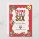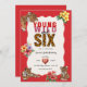 Roar into a sixth birthday celebration with this "Young Wild and Six" invitation! This design features adorable tiger cubs peeking out from behind vibrant tropical flowers, set against a bold red background. The text "Young Wild and Six" is playfully designed with leopard print accents, making it a truly unique and eye-catching announcement for a jungle or safari-themed party. Perfect for any little one turning six and ready for an adventure!