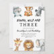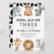 Cute and fun kid's safari animals theme 3rd birthday party invitation featuring illustration of safari animals of giraffe, snow leopard, rhino, lion, elephant, and zebra. The text says "young, wild and three." Perfect for a boy's birthday party.