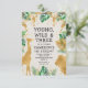 Celebrar o terceiro aniversário da sua coisa selvagem com este convite temático safari da selva, que inclui folhas de ouro falsas (girafa, leão e macacos), folhagem dourada e selva verde, e uma aspersão de confete dourado. Adicione o nome da criança e os detalhes da festa em texto preto sobre um fundo de sondagem. Um padrão de folhagem da selva em verde e ouro decora a parte de trás da carta.