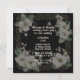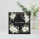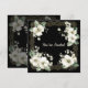A beautiful minimalist black and white wedding invitation with a gold colored frame enclosed a white tree blossom image.
