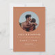 Este convite para o casamento apresenta um sans serif font duo, um moderno design minimalista e uma fotografia redonda personalizada com uma combinação moderna de cor laranja queimada de terracota boêmica. Este convite de casamento é perfeito para o seu casal minimalista favorito. Edite facilmente a foto e adicione seu site de casamento (e/ou código QR na parte traseira). ADICIONANDO UM CÓDIGO QR: ・ VISIT goqr.me ・ Digite seu site e faça o download como um arquivo SVG. ・ Arraste e solte o arquivo SVG na seção 'imagens'. ・ Clique no seu código QR com o Solteiro e ele será pop. Mude a cor, ajuste a escala e mova-a.