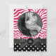Um convite de aniversário muito moderno e na moda para meninas brilhantes. Fundo padronizado de listras zebra rosa-quente e brancas e design de padrão polkadot preto e branco. Acentuado com um brilho falso e bonito, parece uma fita colorida preta presa em um arco, uma etiqueta de rico giro com seu número de aniversário e uma área de fotograma de círculo para sua fotografia. Convide todas as amigas dela para uma celebração especial de festa de aniversário com este cartão bonito feminino, de alta moda e de moda. Ele tem várias áreas de texto fáceis de personalizar no verso para o nome de sua aniversariante e todos os detalhes de festa de festa ou de festa, bem como informações de contato de rsvp, com texto chave em uma cor rosa intensa correspondente. Clique no botão personalizar para redimensionar/reposicionar a foto, se necessário, e verifique se ela cobrir toda a área de fotos.