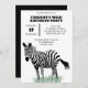 Uma ilustração realista de estilo de uma zebra em algum capim verde ilustra este convite de aniversário personalizado que é adequado para festas para crianças e adultos.