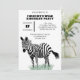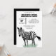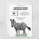 Uma ilustração em estilo realista de uma zebra em pé em alguma grama verde ilustra este convite de aniversário personalizado que é adequado para festas para crianças e adultos.