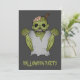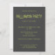Design do cartão de convite para festas do Halloween que apresenta a ilustração assustadora de desenho animado de Destei de um caractere zombie verde em uma cor de fundo da cinza escura (a cor de fundo pode ser alterada para qualquer outra cor também). O zumbi tem um pouco de seu cérebro visível, seus braços estão levantados e ele tem um bastão de madeira marrom preso em sua cabeça. Personalize as áreas de texto com os detalhes do seu evento.