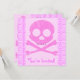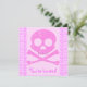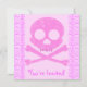 Cartões de convite de dois lados. O Front tem o personalizável "Você é Convidado". Voltar tem com informações de convite — introduza o seu título, data, hora, localização e informações adicionais ou mensagem pessoal.Crânio cor-de-rosa e ossos cruzados, com lavanda de olho com coração cor-de-rosa, e um bandana lavanda com padrão cardíaco. Crânio de pirata rosa bonito.