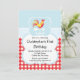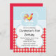 Enfie sua festa de aniversário dos animais do barnyard dos miúdos fora do direito com nosso convite doce do aniversário de criança dos animais de fazenda que caracteriza um torrador ajustado em um guingão vermelho & em um fundo azul. Bonito para uma primeira festa de aniversario de meninas ou uma primeira festa de aniversário dos meninos. Visite nossa loja para ver o outro obrigado bonito dos convites de festas de aniversários & da harmonização dos animais da jarda de celeiro da fazenda você notas, etiquetas & selos postais. Design de Babystar do ©