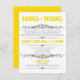 Convites modernos projetados para casamentos em que o casal tem um casamento de destino ou uma pequena cerimônia de casamento privada, e convida os convidados apenas para a celebração da Recepção. A tipografia na frente desses convites é projetada em fontes amarelas e cinzas, e o verso é um amarelo sólido com texto cinza opcional para informações de RSVP potenciais.