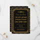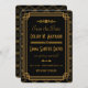 Estes convites apresentam uma paleta de cores preta e dourada, uma moldura geométrica, padrões geométricos e outros detalhes estilísticos, todos inspirados no Art Deco e nos loucos anos 20. Você pode personalizar os campos de texto de exemplo ao seu gosto.