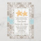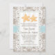 Os convites bonito do casamento da estrela do mar com um damasco e um olhar impresso da pérola projetam a beira com um fundo listrado inspirado náutico e uma fita costurada azul impressa do aqua. A estrela do mar dois amarela na parte dianteira e a parte traseira destes encalham convites temáticos do casamento. Adicione o monograma do casal, os nomes e a data do casamento à parte traseira do cartão. Trabalhos de arte e © Chrissy H. Estúdio do design, LLC. Todos os direitos reservados.